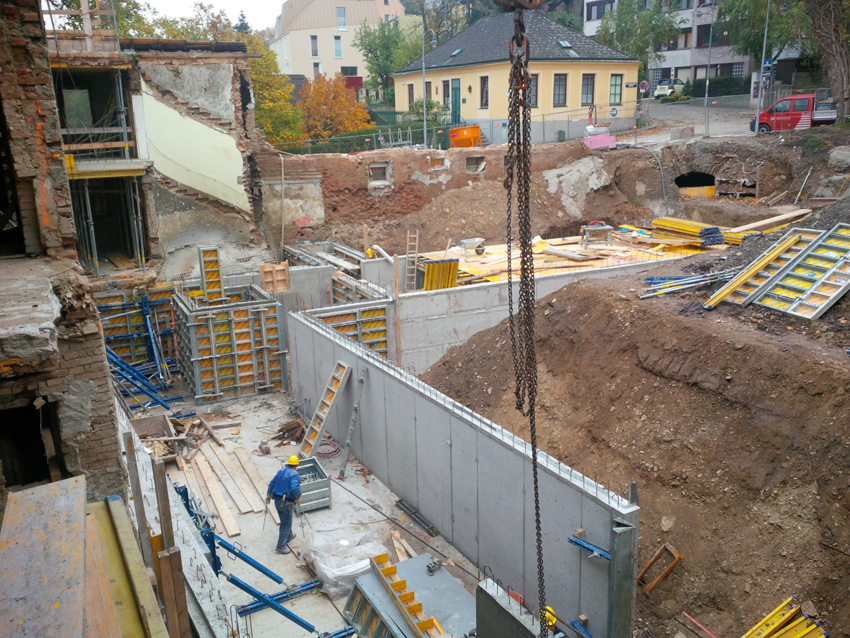 Bereich der zweigeschoßigen Tiefgarage, die im Bereich des vormals verbauten Innenhofs neu errichtet wurde. Generell erwiesen sich der Übergang Mittelmauer / Tiefgarage sowie die Schnittstelle