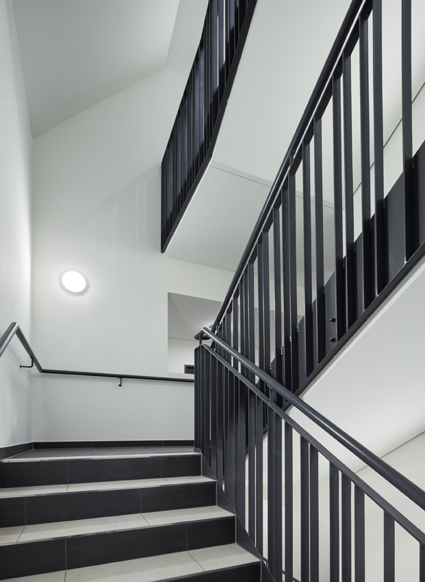 der sich helle, moderne Wohnungen für verschiedene Lebensmodelle öffnen. Bei der Dachlandschaft orientierten wir uns an der Kleinteiligkeit des Altbaus – mit dem Ziel, die beiden Baustile zu