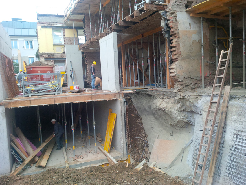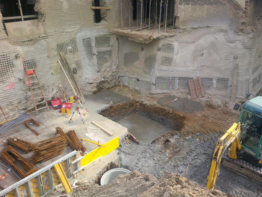 Statik eine Herausforderung dar, galt es doch, die doch beträchtlichen Lasten über diverse Behelfskonstruktionen abzuleiten. Dazu gesellte sich die Frage der Baugrubensicherung, vor allem im